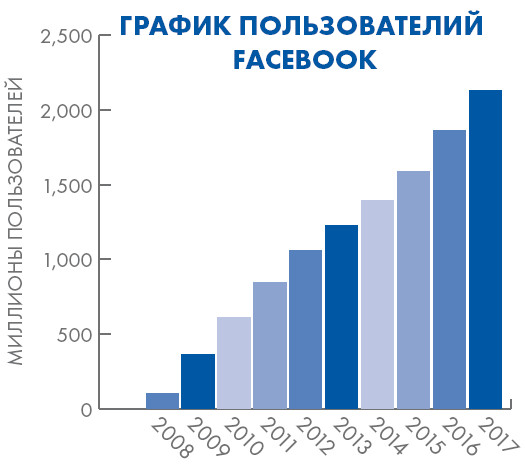 Количество пользователей Facebook неуклонно росло вплоть до конца 2010-х годов. По состоянию на 2018 год в соцсети зарегистрированы два миллиарда человек. Facebook рассчитывает, что ее услугами будут пользоваться более четверти людей на Земле.