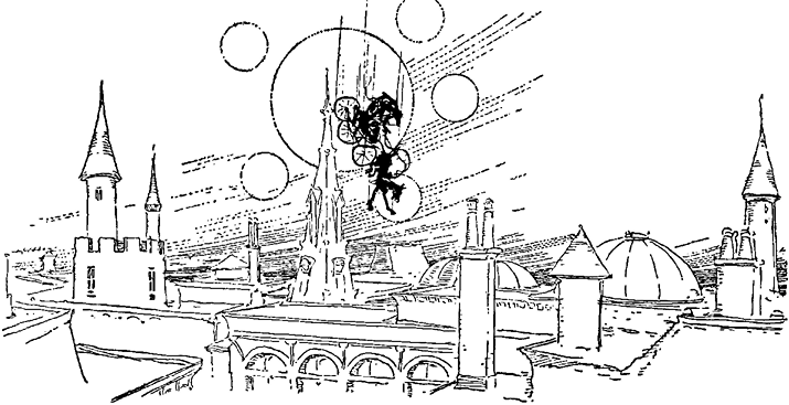 Ця думка підбадьорила Дороті, і вона ще раз виглянула з коляски, щоб дізнатися, звідки виходить дивне світіння, котре дедалі потужніше розганяло каламутну імлу мороку. Далеко внизу вона помітила шість величезних сяючих куль, що ніби висіли в повітрі.