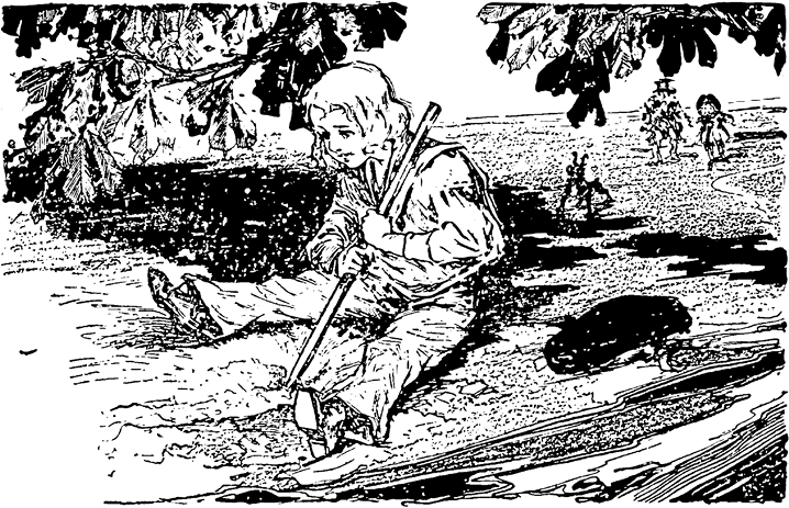 Дівчинка крокувала поруч з Косматим чоловічком, який, щоб скоротати час у дорозі, весело насвистував. Так вони йшли, поки не дісталися тінистої галявини, де ріс величезний каштан: тут дорога різко повертала. У тіні каштана сидів маленький хлопчик у матроському костюмчику і рив землю паличкою. Ймовірно, малюк сидів тут досить давно: яма була така велика, що в неї міг поміститися футбольний м’яч.