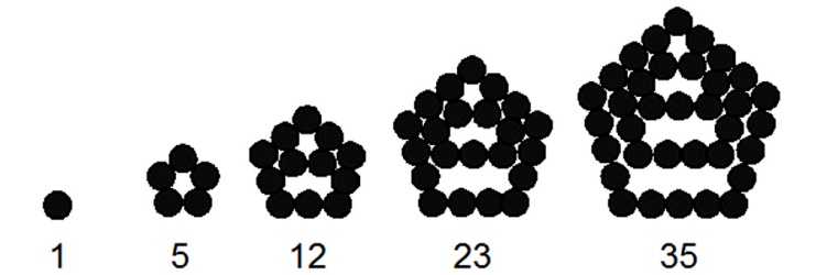 nnВернемся к правильным многоугольникам. На очереди пятиугольные числа: 1, 5, 12, 22, 35, 51, 70, 92, 117, 145, 176, 210, … .