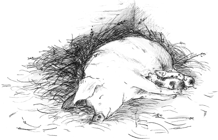 Кроха-поросёнок лежал там же, где она его оставила: поверх двух других детёнышей. Глаза его были закрыты, а тело жутко дрожало. Его пятачок тёрся о сосок свиньи, но он даже не делал попыток начать есть.
