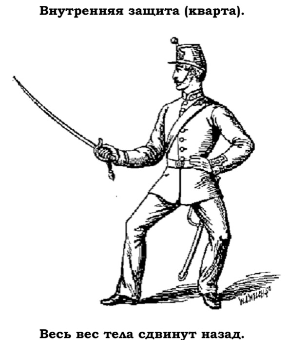 Обе книги тщательно избегают упоминания «терции» и «кварты», предпочитая «справа» или «слава» (от сабли) или «снаружи» или «внутри», как будто эти тайны слишком сложны для нашего интеллекта. Здесь я бы вновь процитировал несколько слов из своей «Системы фехтования со штыком»: