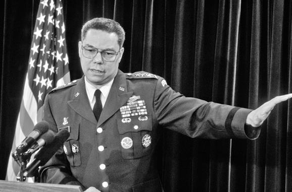 Генерал Колин Пауэлл на брифинге для журналистов по поводу операции «Буря в пустыне» (пресс-центр Пентагона, 24 января 1991 года)
