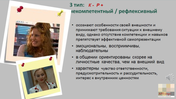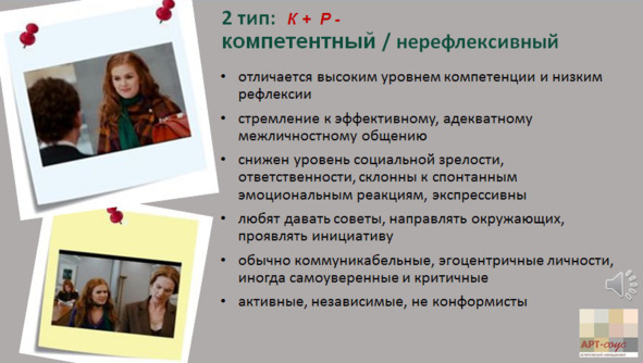 Отличается высоким уровнем компетенции и низким рефлексии. Они интересуются своим внешним видом, основываются на собственных представлениях о моде и стиле, не ориентируются на внешнюю оценку, считают себя экспертами в вопросах самоподачи и общения. С точки зрения психоэмоциональных особенностей и личностных качеств – отличаются сниженным уровнем социальной зрелости, ответственности, самоконтроля, склонны к спонтанным эмоциональным реакциям, экспрессивны. Любят давать советы, консультировать, направлять окружающих, проявлять инициативу. Настаивают на своем, не конформисты.