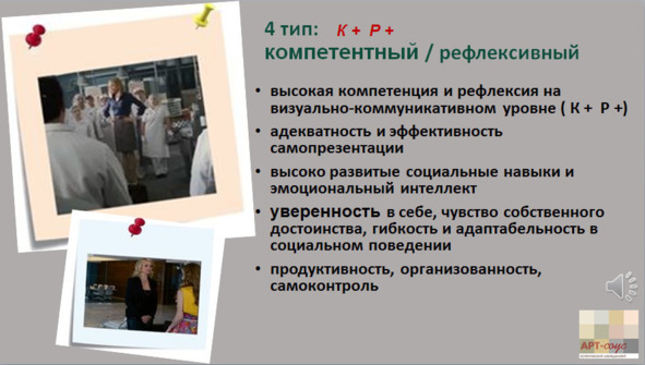 Такие сотрудники отличаются высокой компетенцией и высокой рефлексией. Для данного типа визуальной самоподачи характерна адекватность и эффективность в межличностном общении и достаточно высоко развитые социальные навыки, самоуверенность в личностных и социальных взаимоотношениях, чувство собственного достоинства, обладают высоким эмоциональным интеллектом и адаптивным социальным поведением, продуктивны, эффективны, уравновешенны, организованны, профессиональны.