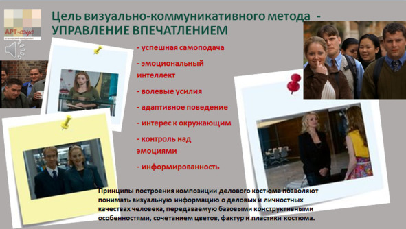 Итак, основная задача визуальной самоподачи – осознанно сформировать образ с учетом требований ситуации и передать сообщение о себе другим участникам общения, т.е. визуальными средствами создать требуемое впечатление.