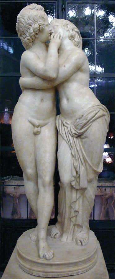 Овидий. Метаморфозы. Книга IV, ст. 368–372[11]Из нежной, охваченной страстью девушки нимфа превратилась в тирана. Подобная смена ролей была очень типичной для эллинистической литературы. Ее мятежное желание обладало такой силой, что двое слились в единое тело. С этого момента у Гермафродита появилась пышная грудь и округлые ягодицы Салмакиды, мужской член между ног и андрогинное лицо, светившееся бесконечной и несравнимой нежностью. И далее в «Метаморфозах», ст. 373–386, мы можем прочесть следующее: