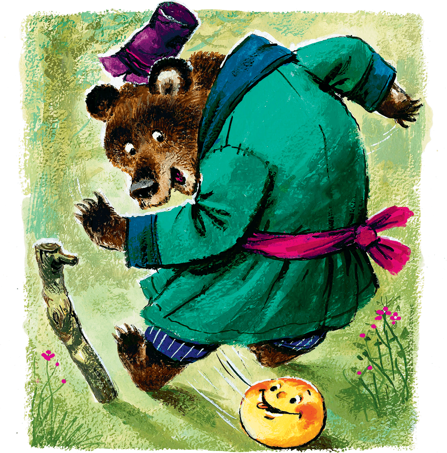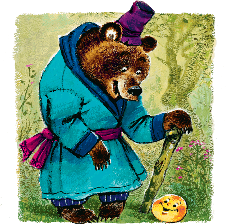 Катится колобок по лесу, а навстречу ему медведь идёт, хворост ломает, кусты к земле гнёт: