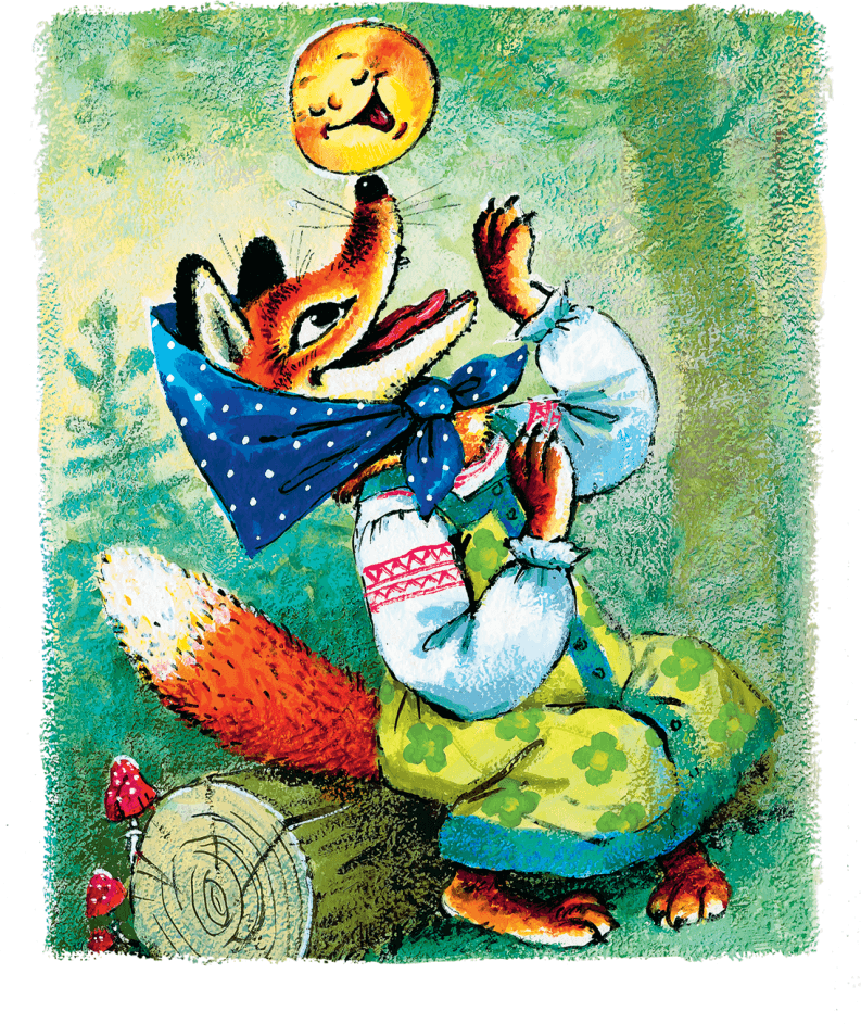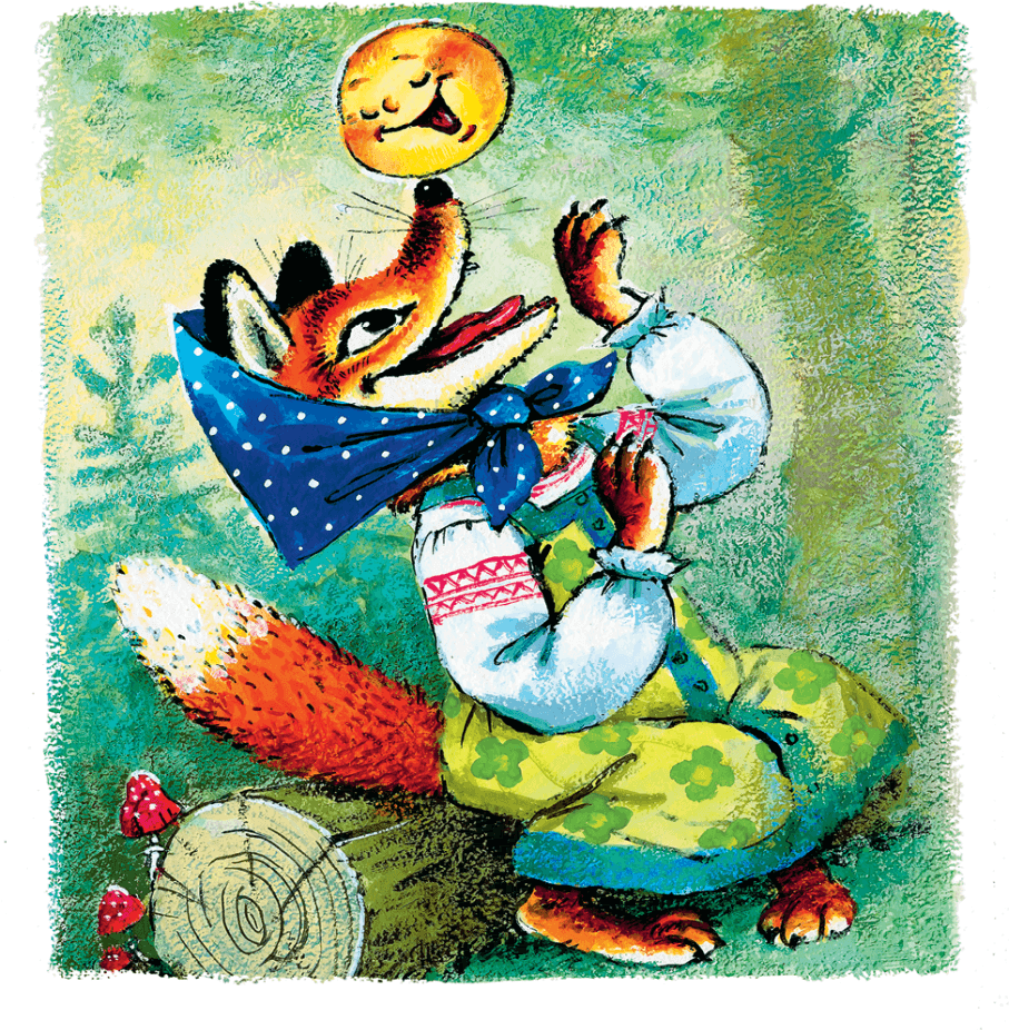 Колобок обрадовался, что его песенку похвалили, прыгнул лисе на мордочку да и запел: