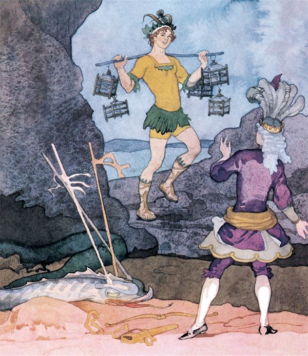 Но тут послышалась весёлая песенка, а затем появился и тот, кто её напевал. До чего же это было забавное существо! Только представьте себе: человек в костюме из разноцветных птичьих перьев! И весь увешан клетками, в которых были птички!