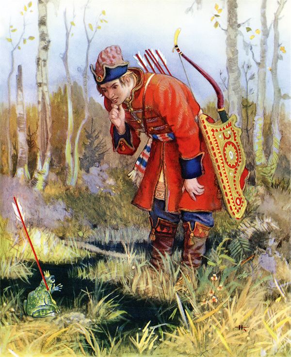 Пустил стрелу старший брат – упала она на боярский двор, прямо против терема девичьего. Пустил средний брат – полетела стрела к купцу на двор и остановилась у красного крыльца, а на том крыльце стояла девица-красавица, дочь купеческая. Пустил младший брат – попала стрела в грязное болото, и подхватила её лягушка-квакушка.