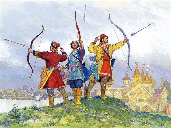 – Дети мои милые, пора вам жениться. Возьмите себе по стреле, натяните тугие луки и пустите в разные стороны; на чей двор стрела упадёт, там и сватайтесь.