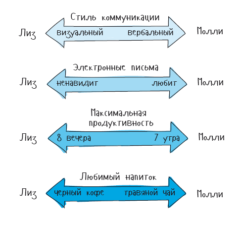 После этой встречи общий интерес к эмоциям, влияющим на работу, побудил нас опубликовать статьи и иллюстрации на эту тему. Но вскоре мы наткнулись на препятствие: мы никогда раньше не работали в таком тесном контакте, и это привело к недопониманию. Молли казалось, что Лиз одержима никому не нужными деталями, в то время как Лиз чувствовала, что Молли слишком торопится. Тональность писем становилась все более напряженной, проекты зашли в тупик. В надежде сохранить личные и профессиональные отношения мы решили поужинать и лично обсудить наши проблемы.