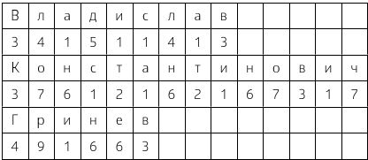 Для начала напишем под каждой буквой имени и фамилии соответствующую ей цифру. У вас получится строка цифр, выглядящая следующим образом: