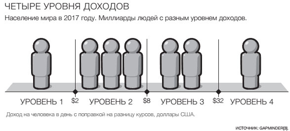 Каждая фигурка на этом рисунке обозначает 1 миллиард человек. Семь фигурок показывают, как население мира сегодня распределяется по уровням доходов на основании размера их ежедневного дохода в долларах США. Как видно, большинство людей живет на двух средних уровнях, где удовлетворяется большинство основных потребностей человека.