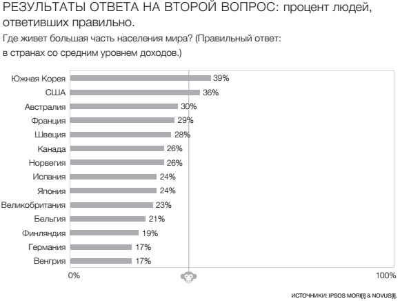 Когда мы задавали подобные вопросы об ожидаемой продолжительности жизни, недоедании, качестве воды и вакцинации – то есть спрашивали, какой процент населения стран с низким уровнем доходов имеет доступ к базовым атрибутам современной жизни, – результаты получались схожими. Ожидаемая продолжительность жизни в странах с низким уровнем доходов составляет 62 года. Большинство людей не голодает и имеет доступ к очищенной воде, большинство детей вакцинируется, а большинство девочек оканчивает начальную школу. Но лишь небольшой процент людей – гораздо меньше, чем 33 процента шимпанзе, – отвечал на эти вопросы верно, а подавляющее большинство опрошенных выбирало самый плохой из вариантов ответа, даже если в таких ужасных условиях люди живут сегодня только в разгар бедствий или в самых неблагополучных регионах мира.