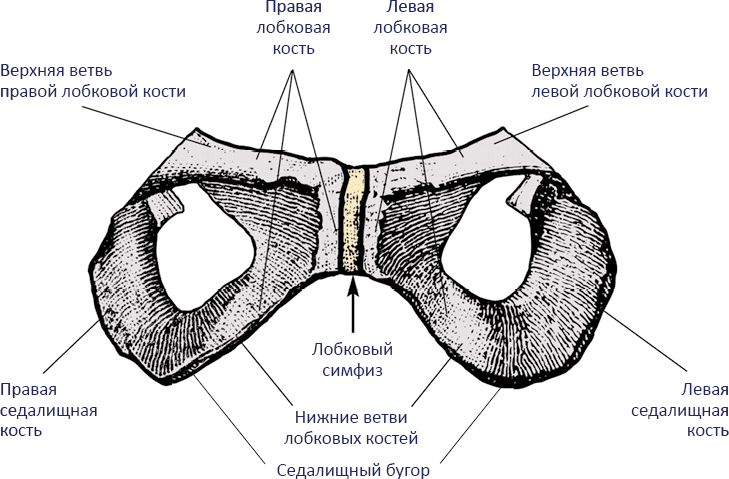 Рис. 1.12. Показано место, где лобковый симфиз соединяет две половины таза. Это увеличенное изображение двух лобковых и седалищных костей (вид спереди) взято из рис. 3.2, на котором показан таз целиком (Sappey)
