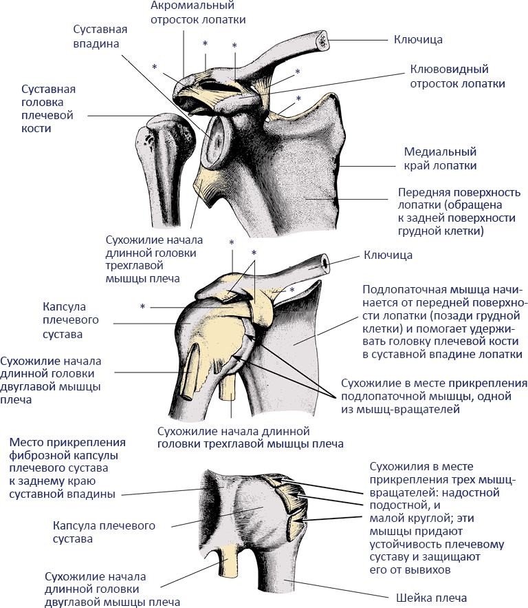 Рис. 1.13. Расчлененный правый плечевой сустав; вид спереди (верхнее изображение); правый плечевой сустав с его капсулой, также спереди (среднее изображение); и правый плечевой сустав с его капсулой, вид сзади (нижнее изображение). Представьте себе грудную клетку, помещенную впереди лопатки справа от наблюдателя на двух верхних изображениях (показанная здесь поверхность лопатки обращена к задней стенке грудной клетки). На нижнем изображении представьте себе заднюю поверхность лопатки слева от наблюдателя; за исключением того, что на нижнем изображении представлено более глубокое рассечение, этот рисунок практически повторяет рис. 1.1. Звездочками указаны укрепляющие связки, а стрелками – мышца манжетки вращателей (Sappey)