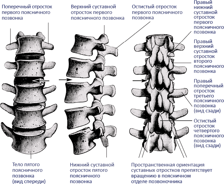 Рис. 1.11. Поясничные позвонки спереди, сбоку и сзади. Вертикальная, передне-задняя ориентация суставных отростков и их суставных поверхностей обеспечивает костный стопор, предупреждающий вращение вокруг продольной оси в этом отделе позвоночника. Пространства, в которых находится межпозвоночный диск, разделяющий второй и третий поясничные позвонки, указаны стрелками (Sappey)