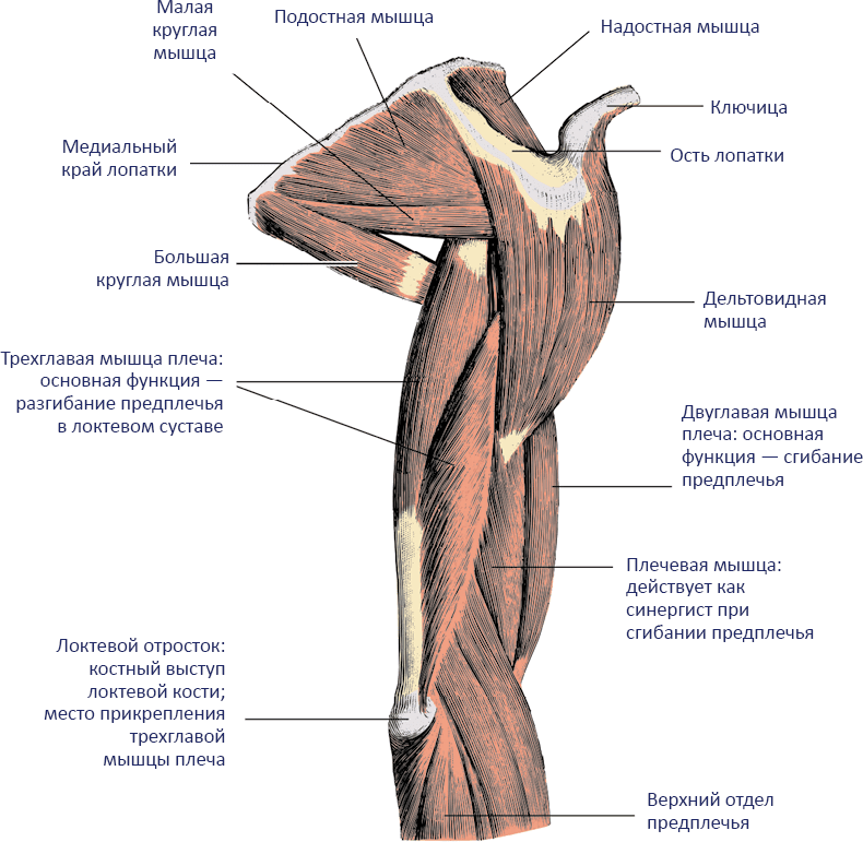 Мышца, как правило, воздействует на сустав (шарнирный или шаровой), и когда мышца сокращается, напряжение воздействует на кости, расположенные по обе стороны от оси сустава. В случае шарнирного сустава, например локтевого, который может открываться на 180°, любая мышца, расположенная над лицевой поверхностью сустава, при сокращении вызовет уменьшение этого угла, а сокращение любой мышцы, расположенной позади сустава, раскроет его из положения полного или частичного сгибания. Например, двуглавая мышца плеча находится над передней поверхностью суставного шарнира, поэтому сокращение ее приводит к сгибанию предплечья (области верхней конечности, расположенной между запястьем и локтем), в ходе которого кисть подтягивается к плечу. Трехглавая мышца плеча находится кзади от суставного шарнира, на задней поверхности плеча (части верхней конечности между локтем и лопаткой), и, таким образом, сокращение этой мышцы приводит к разгибанию в локтевом суставе, то есть к раскрытию шарнира (рис. 1.1).
