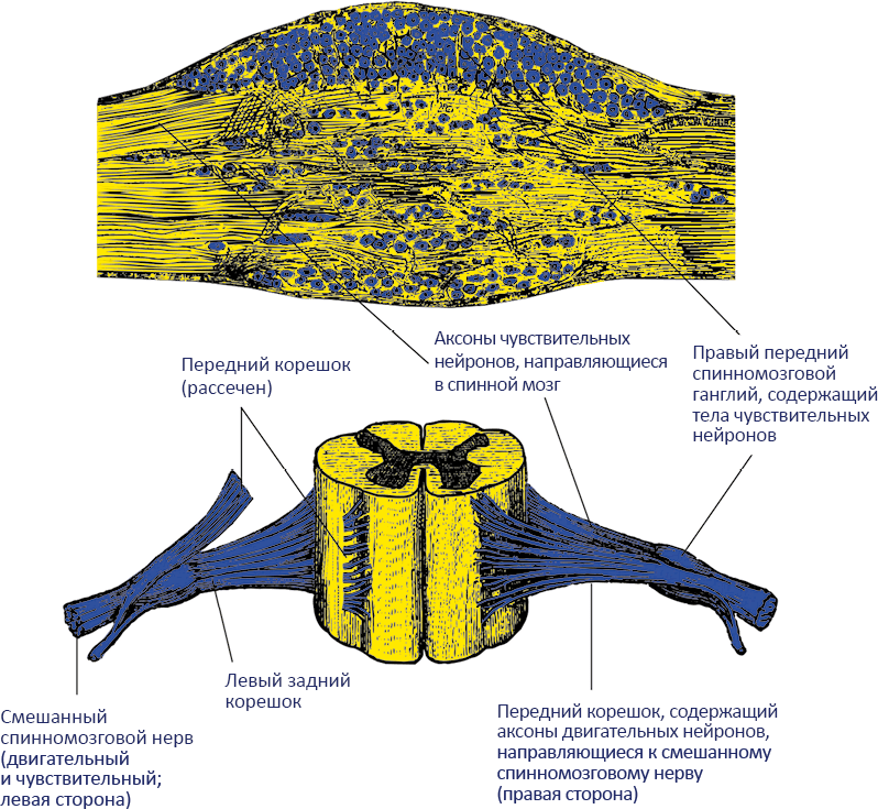 Мы ощущаем все происходящее в материальном мире посредством специализированных клеток, называемых нейронами, сто миллиардов которых находятся в одном только головном мозге; эти клетки направляют потоки информации по всему телу и внутри центральной нервной системы (головного и спинного мозга). Вся передача информации осуществляется всего лишь тремя типами клеток: чувствительными нейронами, которые переносят поток ощущений от периферической нервной системы (по определению, это все части нервной системы, находящиеся вне головного и спинного мозга) в центральную нервную систему и в сознание; двигательными нейронами, которые передают из головного и спинного мозга инструкции, предназначенные для периферической нервной системы; и вставочными, или ассоциативными нейронами, которые находятся между чувствительными и двигательными нейронами, – эти нейроны передают сигналы нашей воли и желаний двигательным нейронам. Сенсорная (чувствительная) информация поступает в задние рога спинного мозга через задние корешки, а двигательная информация выносится из передних рогов спинного мозга в передние корешки. Задние и передние корешки сливаются, образуя смешанные (двигательные и чувствительные) спинномозговые нервы, которые, в свою очередь, иннервируют все структуры организма (рис. 1.3–1.9).