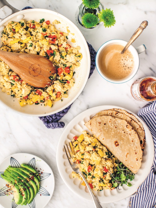 Прежде чем вы перевернете страницу, потому что не любите тофу, пожалуйста, дайте ему шанс! Тофу, как губка, впитывает любые вкусы, так что большое количество специй может заставить его сиять. В этом рецепте кумин и куркума добавляют аромата, дижонская горчица дает нужный «яичный» вкус, а смесь миндального молока и пищевых дрожжей помогает добиться сливочной, мягкой текстуры. Желтая тыква, перекликающаяся по цвету с тофу, сделает ваш завтрак красивым и солнечным.