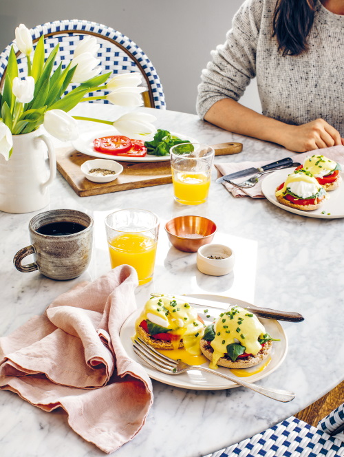 Я обожаю салат капрезе, поэтому решила придумать завтрак на его основе. Помидоры, базилик и яйцо пашот (вместо мягкой моцареллы), поданные на подпеченном английском маффине, вкуснятина! Но главная «звезда» рецепта – соус. Традиционный голландский соус для меня слишком тяжелый, и его непросто готовить в домашних условиях. Этот же сливочный соус на основе орехов кешью с кислинкой лимона просто взбивается в блендере, а хранить его в холодильнике можно несколько дней.
