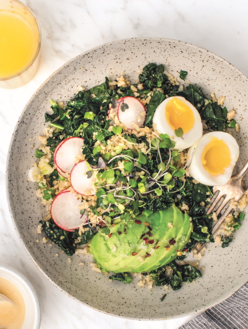 Этот рецепт родился под впечатлением боула, который мне подали в нью-йоркском ресторане Egg Shop. Когда нам принесли меню, Джек указал на блюдо с описанием «киноа, кейл, авокадо и яйцо» и сказал: «Я точно знаю, что ты закажешь». Мне оно настолько понравилось, что, как только мы вернулись домой, я на первый же завтрак приготовила его, запомнив эти простые, но вдохновляющие вкусы. Оно готовится очень просто, а добавление лимонного сока, пасты мисо и дижонской горчицы придает блюду яркость. Вы полюбите есть капусту кейл на завтрак!