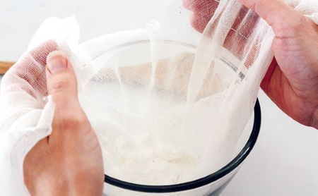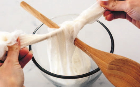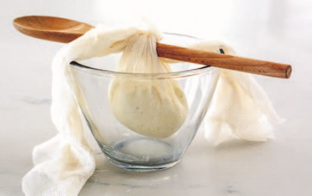 Выложите смесь на большой квадрат марли, соедините концы марли и завяжите вокруг длинной ручки деревянной ложки. Поместите ложку над большой миской так, чтобы мешочек со смесью не касался дна. Уберите в холодильник на 48 часов, чтобы сыр стал плотным. Готовый сыр должен легко отделяться от марли. Если он к ней прилип, оставьте сыр в холодильнике еще на 24 часа.