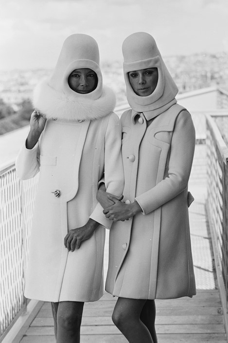 Ил. 1.3. Шляпы-шлемы из осенне-зимней коллекции Пьера Кардена 1966/67 года в сочетании с напоминающими скафандры белыми пальто © Francois Pages/Paris Match