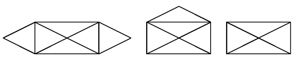 Первую фигуру можно начать вычерчивать с любой вершины, второй «конверт» – только с одного из нижних углов, заканчивая в противоположном нижнем углу. Неподдающейся оказывается третья фигура, хотя на первый взгляд она проще, так как содержит меньшее количество линий.