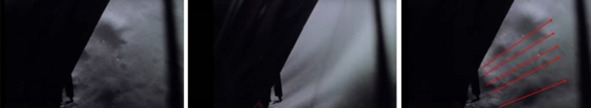 Первыми кадрами прилунения была съемка «лунной посадки» из кабины так называемого Лунного модуля. Американские скептики, которые получили в свое распоряжение более качественные кадры, сразу заметили, что «двигатель», который раздувает «лунную пыль» находится не в центре «ЛМ», а сбоку. На кадре справа стрелками показано направления разлета грунта. Источник давления, откуда идет воздействие на грунт, находится слева от иллюминатора, внизу. Кадры получены из фильма НАСА «Landing on the Moon: July 20, 1969». [1]