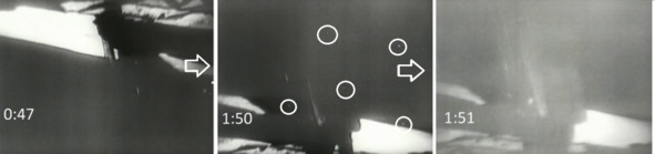 Нейл (или его дублер) в этот момент, левой рукой держался за лестницу, правая рука не могла изменить направление съемки с помощью приводов или веревки. На кадрах (1:50) начали проявляться светлые точки, они отмечены окружностями. Для того чтобы признать эти съемки фальшивками, не нужно было никаких перехватов кадра «Восход Земли», перехвата «переговоров». Достаточно было посмотреть внимательно, лучше в записи, «лунную трансляцию», кадры которой получали только американские фальсификаторы. С первых минут этой «трансляции», оператор телекамеры, который находился на «Луне» США выдал себя! Только он мог изменить два раза направление съемки телекамеры, изменить увеличение и другие параметры. Если смотреть дальше «трансляцию» внимательно, то в ней обнаруживается еще много интересных и забавных аномалий! В роликах НАСА признаки фальсификации были на всех кадрах.