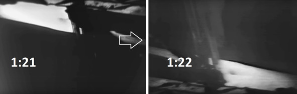 В другом фильме НАСА «Restored Apollo 11 EVA» [5] есть аналогичный момент в начале «трансляции», когда на моменте 1:22 сменилось направление съемки. В этот момент Нейл, по версии НАСА был на лестнице. Олдрин, якобы, был в кабине. Он потом появиться в кадре этого фильма НАСА. Удаленного управления камеры с помощью мобильного пульта, технические писатели НАСА не декларировали. С помощью тросиков и веревочек изменить параметр съемки невозможно. Остается только один вариант: изменение направления съемки телекамерой осуществил оператор. Никто не увидел, что доказательства обмана находятся на кадрах этой телевизионной передачи. Фальсификаторы НАСА допустили ряд непростительных ошибок, которые будут продемонстрированы ниже на кадрах фильма НАСА. [5]