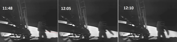 На кадрах трансляции с кадра «2:00» по кадр «2:20» фальсификаторы допустили третью существенную оплошность: «космонавт» был поднят с помощью лонжей и в таком подвесном состоянии актер висел всю эту сцену. Правой ногой он не упирался в перекладину лестницы, это видно в отдельных моментах, как правая его нога болтается в пространстве. Левая нога точно не упирается в перекладину. И тело нижняя часть и правая и левая нога раскачивается на подвесе то влево то вправо.