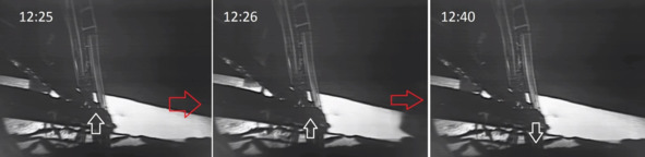 В период съемки с кадрами 11:47 по 12:23 хорошо наблюдается колыхание полотна. Это хорошо видно на примере изображений в шести кадрах фильма НАСА. На моменте 11:47 идет движение полотна, материи вниз, в следующем кадре заметное движение полотна вверх. Потом снова движение вниз и снова вверх. Движение полотна показано белыми стрелками. Лунный актер США находился в этот момент справа от лестницы. Часть ранца видна в кадре справа внизу. Второго лунного актера в кадре нет, он тоже не мог осуществить воздействие на полотно, чтобы оно, таким образом, начало колыхаться. Сомнительным будет оправдание такому колыханию, что лунные актеры могли дергать за тонкие тросики это полотно. В этом случае полотно совершало бы горизонтальные колебания, влево-вправо, что в этих кадрах не наблюдалось. На выделенном фрагменте кадров колыхание полотна особенно заметно. «Лунотрясение» исключается. «ЛМ» и телекамера не дрогнули от сотрясения почвы, потому, что такого «лунотрясения» не было.
