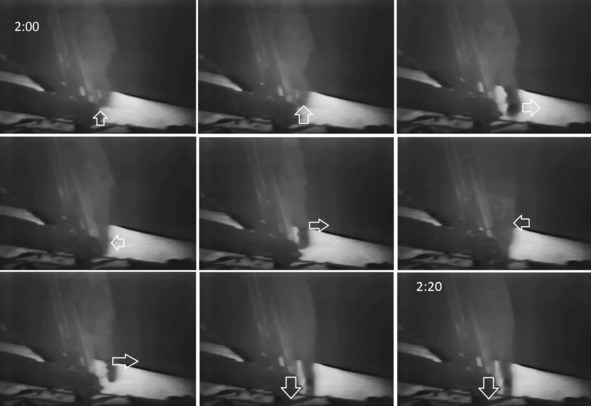Это хорошо наблюдается на кадрах 12:25 и 12:26. На этих снимках прекрасно видно, что кто-то тянет эти вещи вверх, а не влево! Колебания объекта посредине проходит в нескольких моментах без единого отклонения влево, в сторону «космонавта». Движения этого объекта проходят вверх вниз, без отклонений в сторону. Это означает, что «космонавт» ушедший влево, не был причастен к странным колебаниям тросов под «ЛМ». Такие передвижения материи могли быть вызваны неловкими действиями помощника режиссера на киноплощадке НАСА. Кроме этого там могли работать мощные вентиляторы и кондиционеры. Движение воздуха воздействовало на эластичные элементы, вроде больших лоскутов материи.