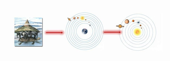 Вспомните как развивались представления (модели) о Земле по мере накопления знаний и установления новых взаимосвязей: от плоскости на китах и черепахах до Земли-центра и до того, что она вращается вокруг Солнца (рис.2.3).