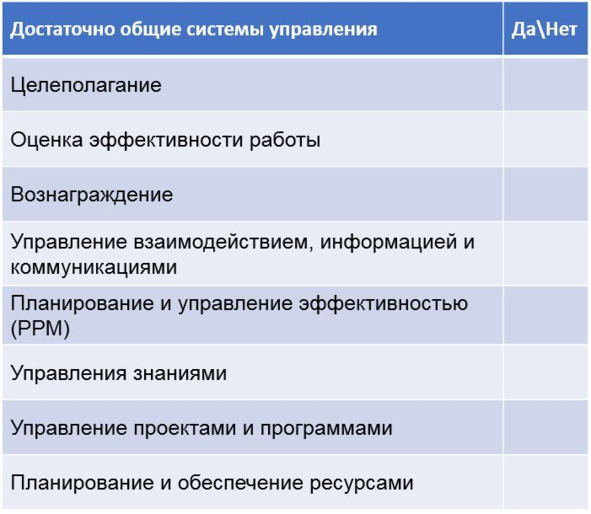 Сделайте небольшое упражнение прямо в данной книге. Ниже в таблице на рис.3.4 перечислены несколько достаточно общих систем управления – поставьте «галочки» или «1» там, где Ваша HR-функция имеет влияние или является собственником: