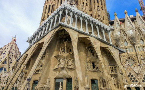 Этот фасад из стекла и бетона еще не окончен. И, по замыслу, он станет центральным входом в Храм Святого Семейства. К входу спроектированы лестницы и мосты, но они должны разместиться на том месте, где сейчас стоят жилые дома. Это еще одна нерешенная проблема на пути завершения строительства.