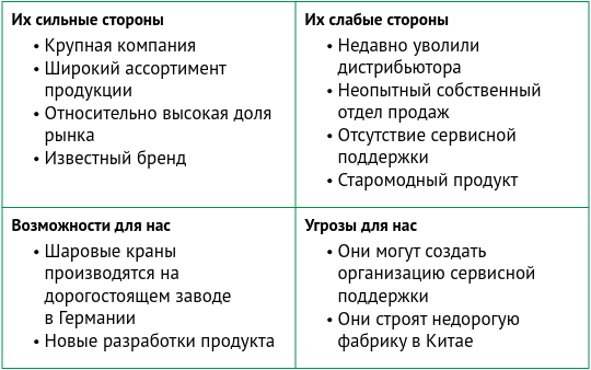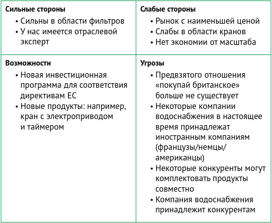 При проведении SWOT-анализа сильные и слабые стороны, возможности и угрозы обычно указываются на одной странице. Следует разделить страницу на четыре квадрата и, как показано на рисунке 2.3, перечислить в верхних квадратах сильные и слабые стороны, а в нижних – возможности и угрозы.