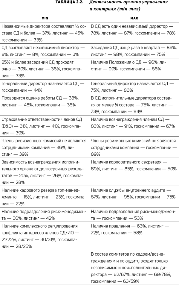 Данный компонент практики корпоративного управления в исследовании охватывает 20 рекомендаций CGBP. В табл. 2.3 представлены результаты анализа в формате min-max.