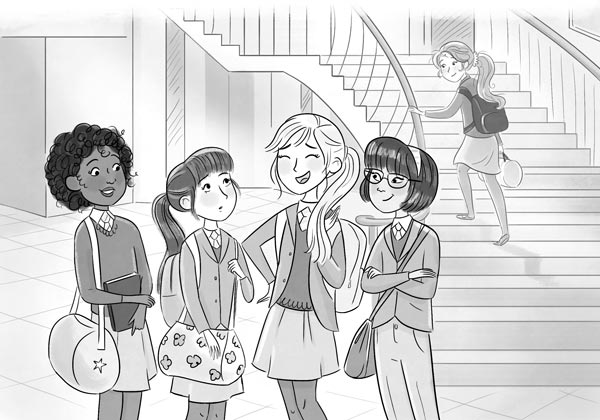 «Я уже пробовала ориентироваться по стрелкам», – уныло подумала Хлоя, направляясь к лестнице. Она огляделась в поисках Лили, но та, похоже, уже встретила каких-то подружек. Они стояли у подножия лестницы – Лили и три девочки постарше – и о чём-то болтали, хотя Лили выглядела смущённой и нервно сжимала в руке ремешок школьной сумки. Проходя мимо, Хлоя услышала краем уха, что они говорят о маме Лили. Наверное, на них произвело впечатление, что её мама актриса. У одной из этих девочек были яркие голубые глаза и длинные волосы, почти такие же длинные, как у Лили, только не чёрные, а очень светлые, с золотистым отливом. Хлоя решила не вмешиваться в разговор, а подойти к Лили позже.