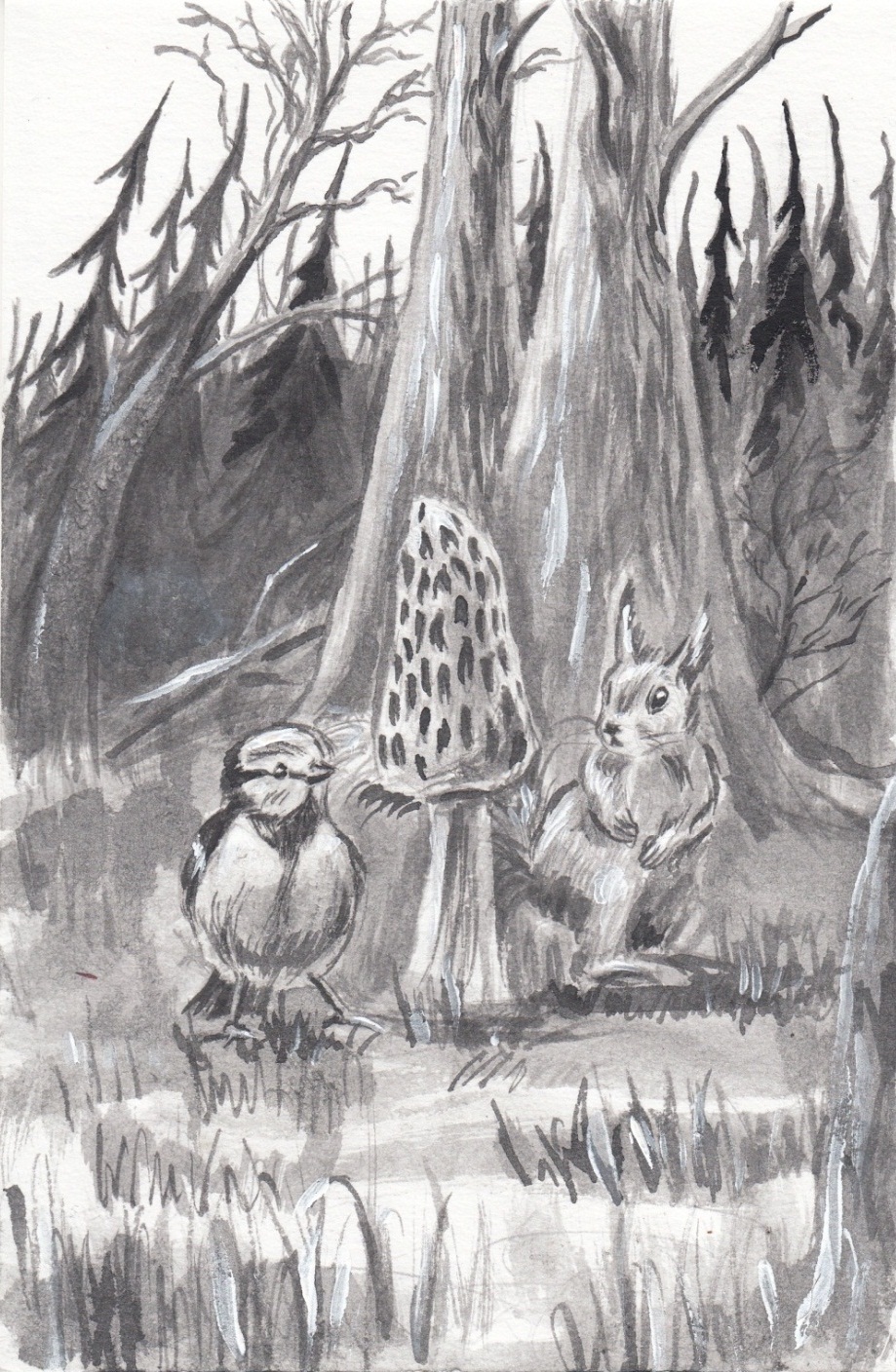 Прошло лето, осень, зима. Наступила весна. Снег сошёл, и на косогорах зацвела золотистая мать-и-мачеха, на опушке вспыхнули синие, фиолетовые и розовые искорки цветков медуницы, закружили над землёй мохнатые шмели. Дятел, пролетая над просекой, глазам своим не поверил: в апреле вырос гриб! Странный такой гриб, с коричневой сморщенной шляпкой. Созвал дятел зверей и птиц. Мышка подошла к грибу и понюхала его.