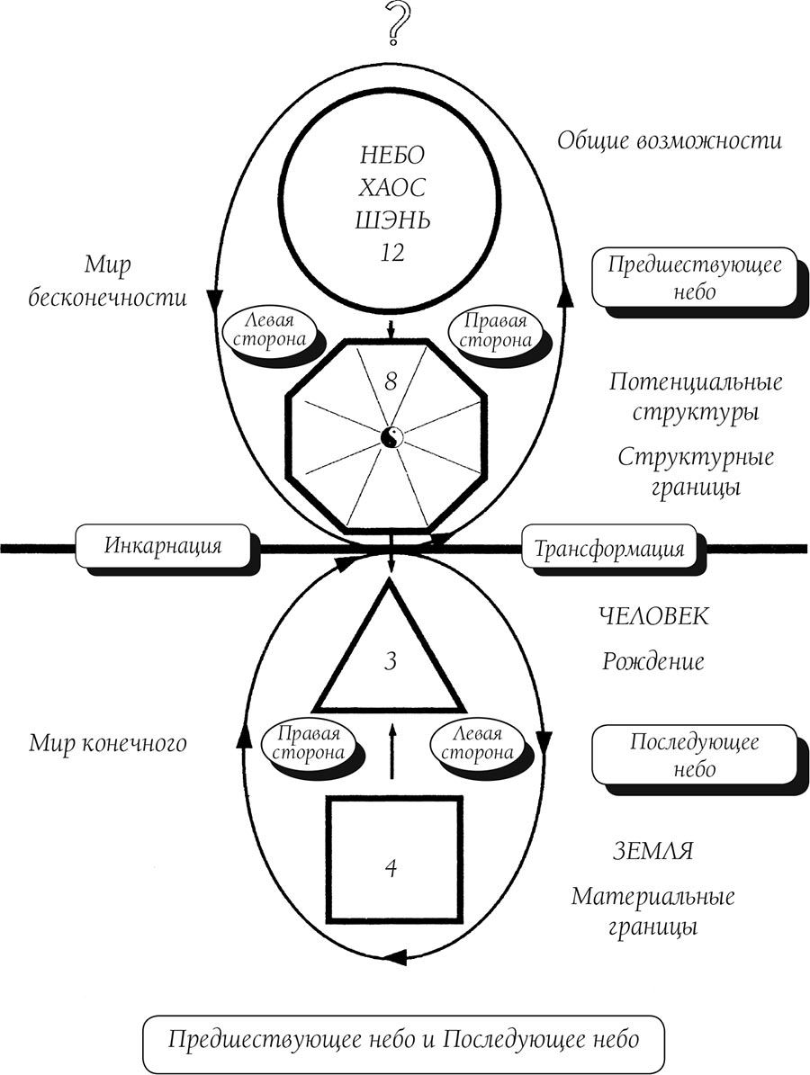 Согласно даосской философии, в жизни человека существуют два состояния. Первое предшествует его рождению, а второе формируется после него. Рождение отмечает переход через порог между «Небесами», как определяет это философия дао. Предшествующее небо представляет все, что «существует» или происходит до рождения, то есть до момента, когда человек приходит в наш мир. Последующее небо символизирует все, что «существует» или происходит вплоть до его смерти. Соответствующая схема позволяет лучше и нагляднее представить эти понятия. Опираясь на нее, мы подробно рассмотрим эти разные состояния.