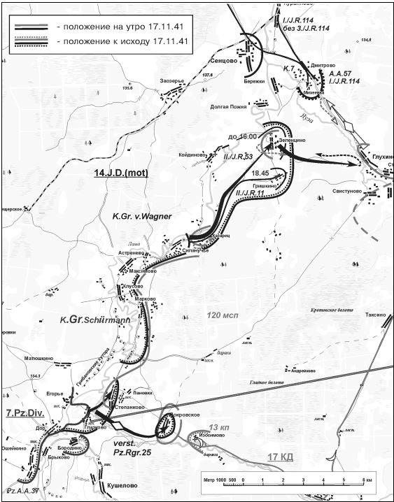 Командование 2‐й танковой дивизии рассчитывало на помощь соседа – 11‐й танковой. Однако, хотя та и перешла в наступление на широком фронте, ее действия благодаря стойкости батальона Момышулы и его соседей – кавалеристов, никак не сказались на общей обстановке у 2‐й танковой. Большую часть дня на восточном фронте немцам пришлось обороняться. Так, в 12.50 была отбита атака от Шишкино на Рождествено[160]. Об этом эпизоде наша сторона ничего не сообщает. Напротив, отмечается, что в течение дня 1075‐м стрелковым полком были отбиты две атаки противника силой до двух батальонов пехоты, поддержанных 17 танками из района Рождествено, Лысцово. Развязка наступила вечером. В распоряжение нашего полка прибыли шесть танков 1‐й гвардейской танковой бригады. При их поддержке в 18.00 была организована атака на Лысцово. Наступление было встречено контратакой пехоты и танков противника. В результате 1075‐й полк не только не взял Лысцово, но был вынужден оставить Шишкино, отойдя на западную опушку леса восточнее деревни. При этом полк понес большие потери[161]. По немецким данным атака на Лысцово частями боевой группы 1 была отражена в 17.25[162]. Шишкино было занято после жестокого боя в 17.55[163]. Но понятно, что небольшая разница во времени у обоих противников не имеет принципиального значения.