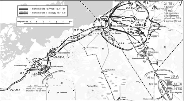Кроме того, 1‐я стрелковая рота и минометный взвод мотострелкового батальона бригады «в д. КОПЫЛОВО были перехвачены командиром 107 СД от имени Командарма 30 и направлены на участок этой дивизии». До этого изъятия в мотострелковом батальоне оставалось только две роты. Поэтому его сила уменьшилась вдвое. Минометный взвод вернулся в бригаду только 25 ноября, но без материальной части, разбитой в бою у ст. Решетниково. А рота не появилась даже к этому времени[247].