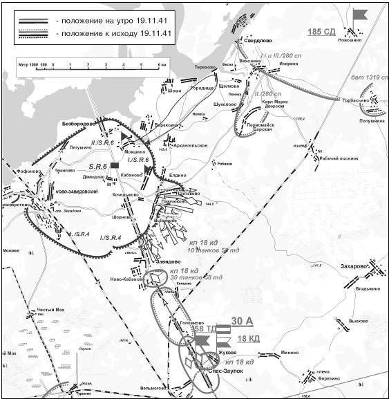 19 ноября удар 30‐й армии вдоль Ленинградского шоссе в направлении Московского моря пришелся по правому флангу 6‐го стрелкового полка Х. фон Мантейфеля. Незадолго до начала советского наступления, в 7.00, штаб полка издал приказ об обороне[321]. Затем в 08.00 один взвод 6‐й роты получил задачу провести разведку в северо-восточном направлении, пройдя через Вараксено, Терехово и Архангельское. Взвод возвратился в 12.30 и доложил, что в Терехово и Архангельском советских частей нет. Путем опроса местных жителей было установлено, что они отошли на северо-восток[322].