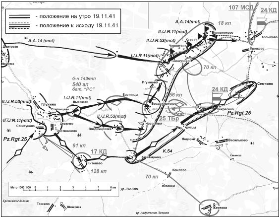 «В 14.00 19.11.41 противник силою до полка пехоты и 30 танков перешел в наступление и прорвал оборону в районе ПОДОРКИ, НЕКРАСИНО (здесь явно речь идет о действиях немецкого 25‐го танкового полка – Прим. автора) вследствие чего ВОЗДВИЖЕНСКОЕ оказалось окруженным.