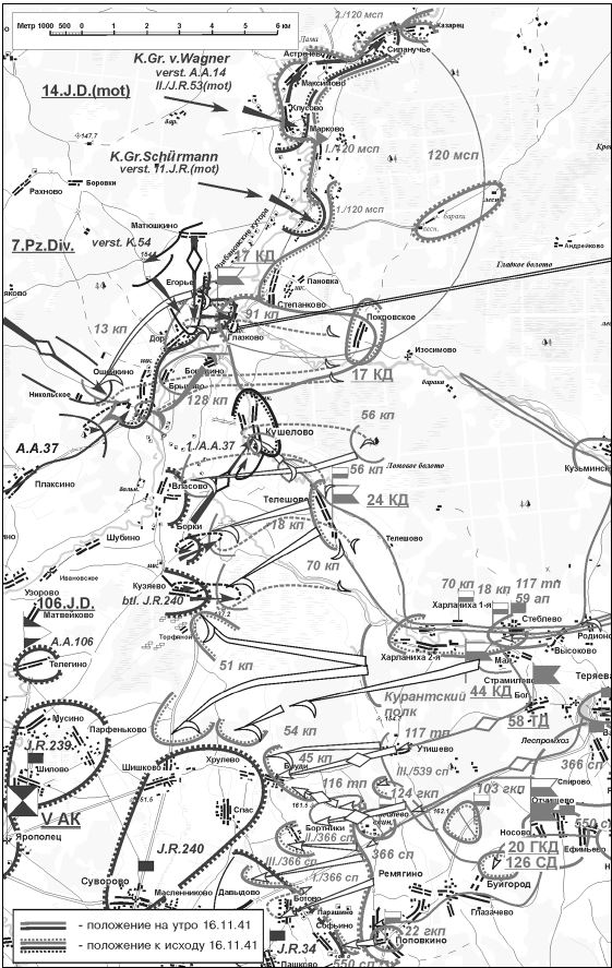 Таким образом, только к концу суток, уже весьма потрепанная, дивизия смогла начать подготовку к выполнению нового приказа. К середине следующего дня выяснилось, что меры для парирования угрозы из полосы соседней армии, включавшие использование только одной 17‐й кавалерийской дивизии, были явно недостаточны. При этом ход ее боевых действий 16 ноября показал, что опасность возникла непосредственно на правом фланге 16‐й армии, значительно ближе, чем район Сенцова.